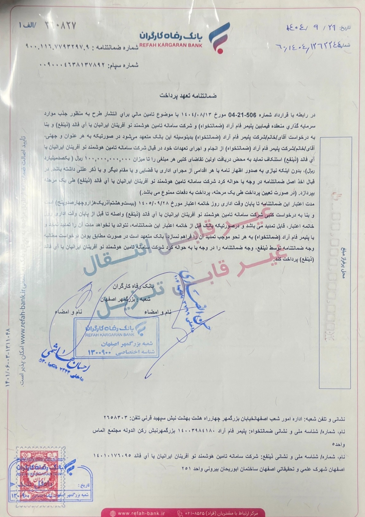 ضمانت¬نامه این طرح از سوی بانک رفاه کارگران با شماره سپام 0090004638137892 در تاریخ 1404/09/29 صادر شده و تا تاریخ 1405/09/28 معتبر می¬باشد و با درخواست شرکت سامانه تامین هوشمند نوآفرینان ایرانیان تا زمان مورد درخواست این شرکت قابل تمدید است.