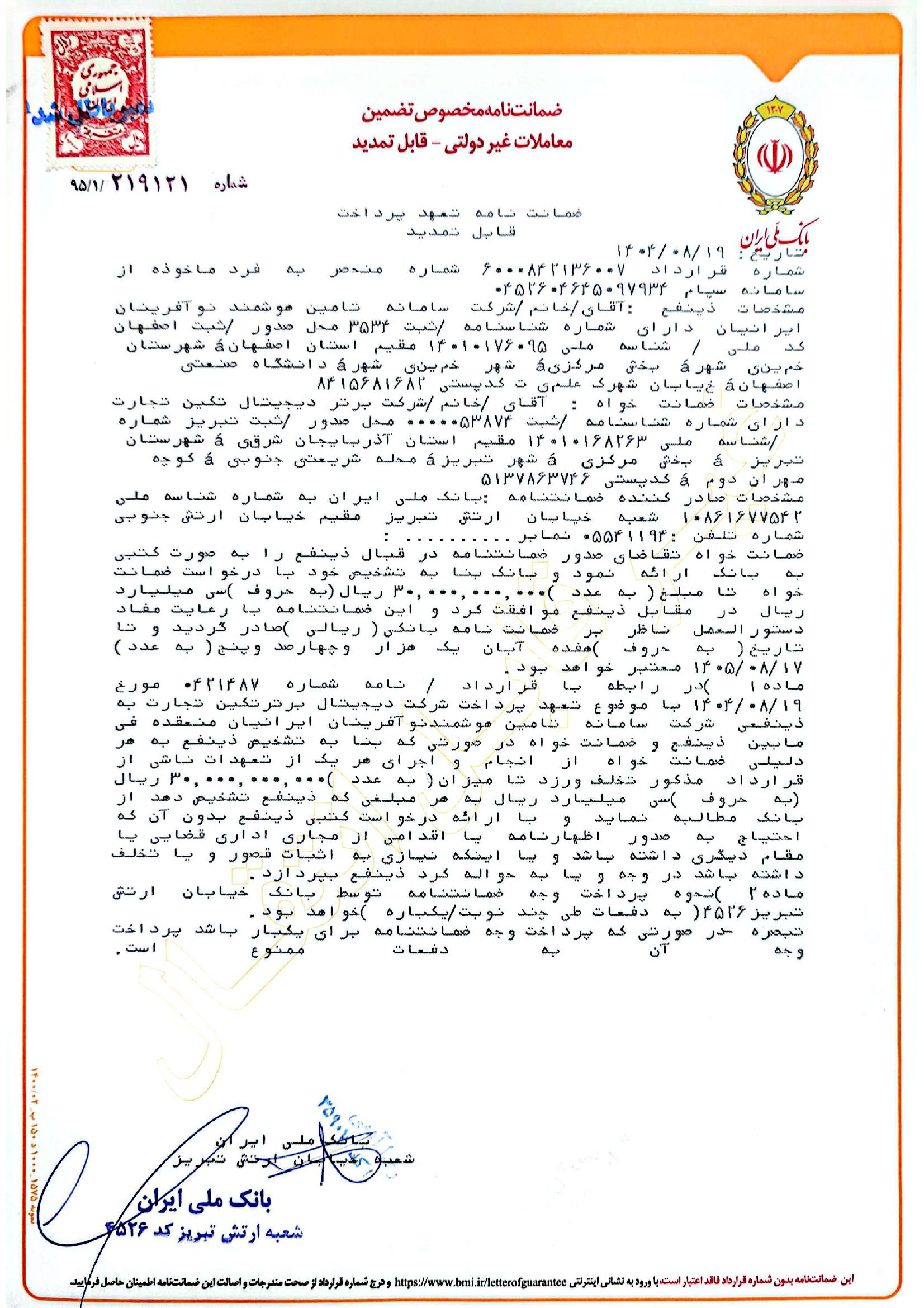 ضمانت¬نامه این طرح از سوی بانک ملی ایران با شماره سپام 0452604645097934 صادر شده که تا تاریخ 1405/08/17 معتبر میباشد تضمین شده و با درخواست شرکت سامانه تامین هوشمند نوآفرینان ایرانیان تا زمان مورد درخواست این شرکت قابل تمدید است.