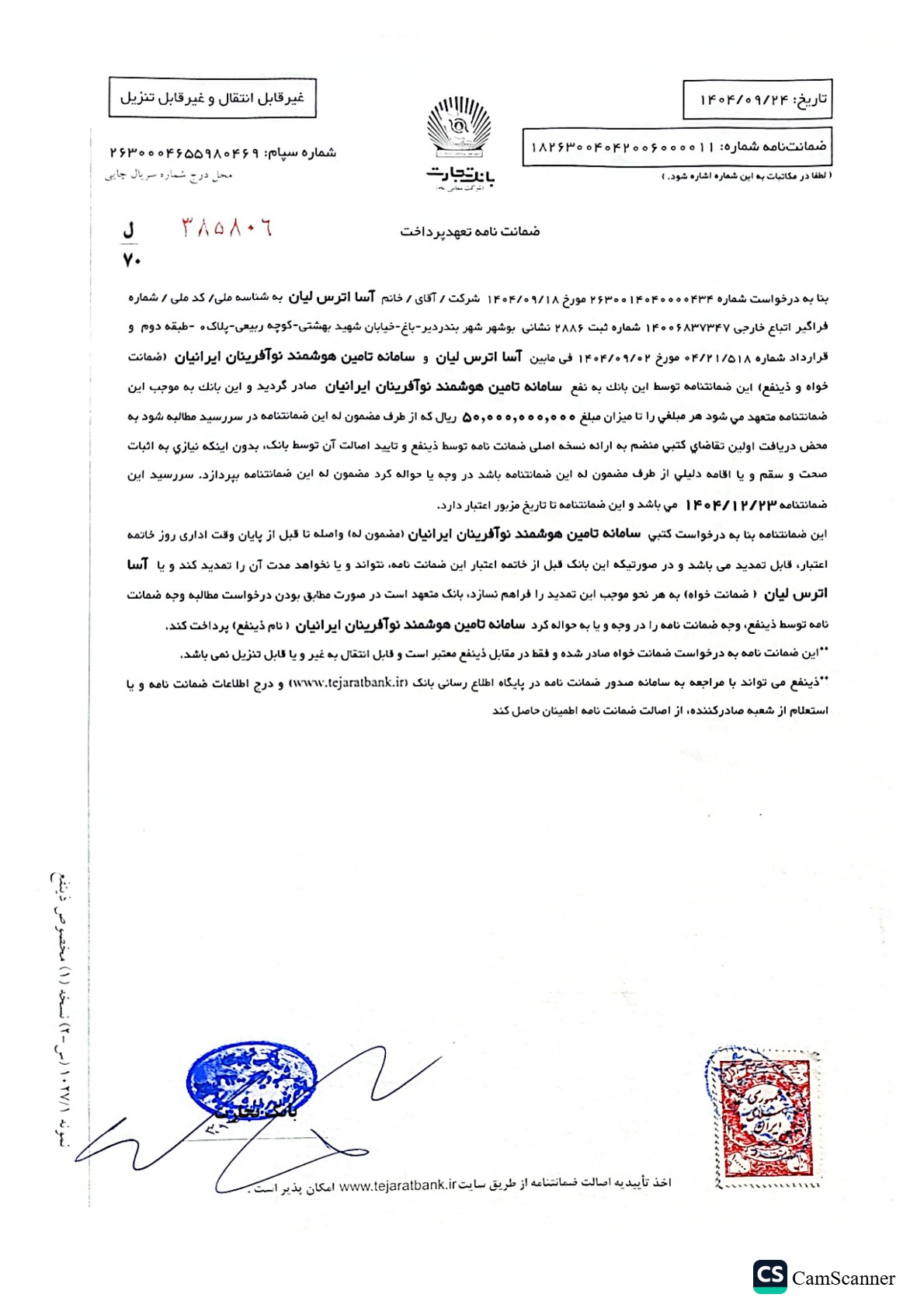 ضمانتنامه این طرح از سوی بانک تجارت با شماره سپام 2630004655980469 صادر شده که تا تاریخ 1404/12/23معتبر میباشد تضمین شده و با درخواست شرکت سامانه تامین هوشمند نوآفرینان ایرانیان تا زمان مورد درخواست این شرکت قابل تمدید است.