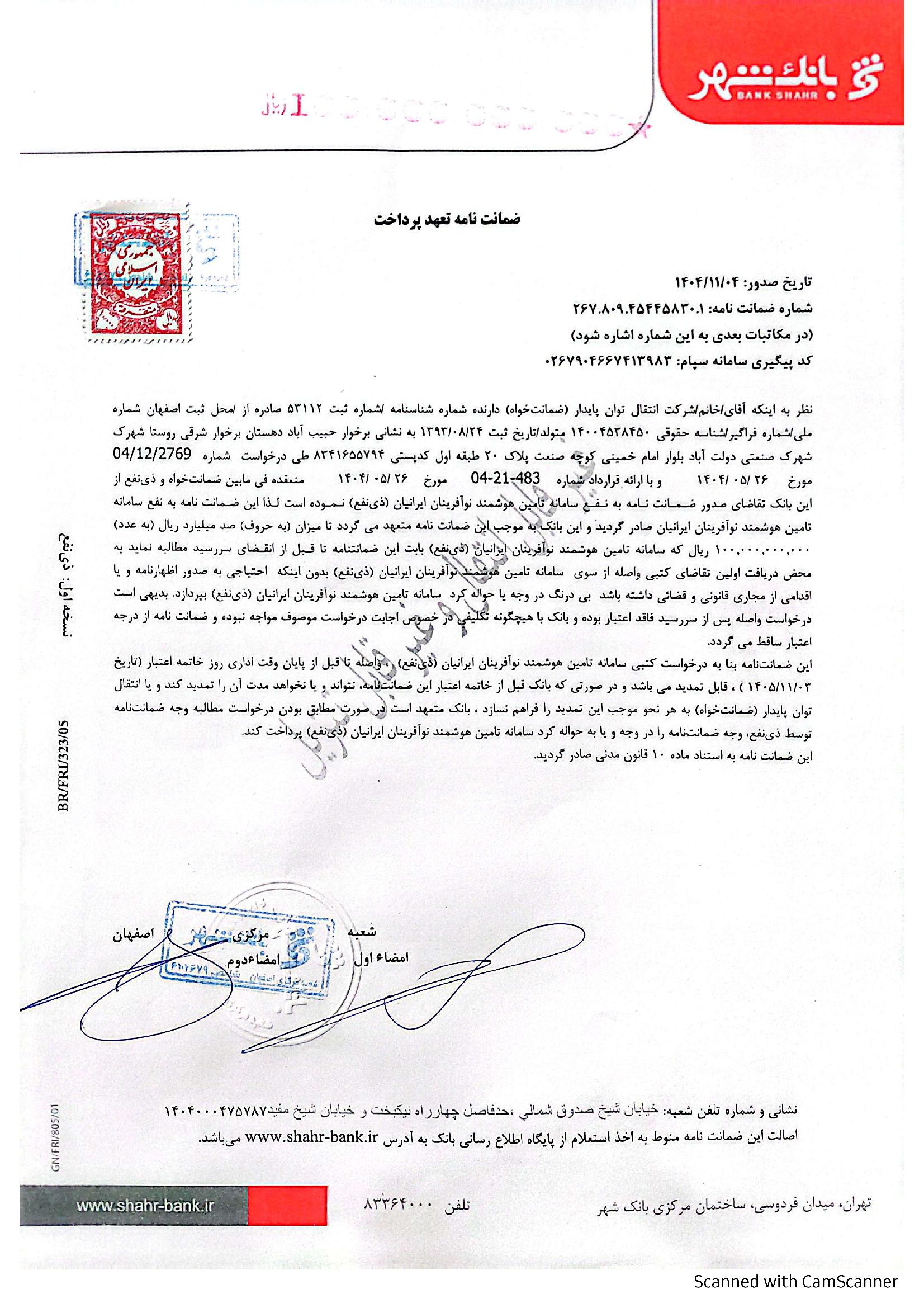 ضمانت نامه این طرح از سوی بانک شهر با شماره سپام 0267904667413983 صادر شده که تا تاریخ 1405/11/03 معتبر می باشد و با درخواست شرکت سامانه تامین هوشمند نوآفرینان ایرانیان تا زمان مورد درخواست این شرکت قابل تمدید است.